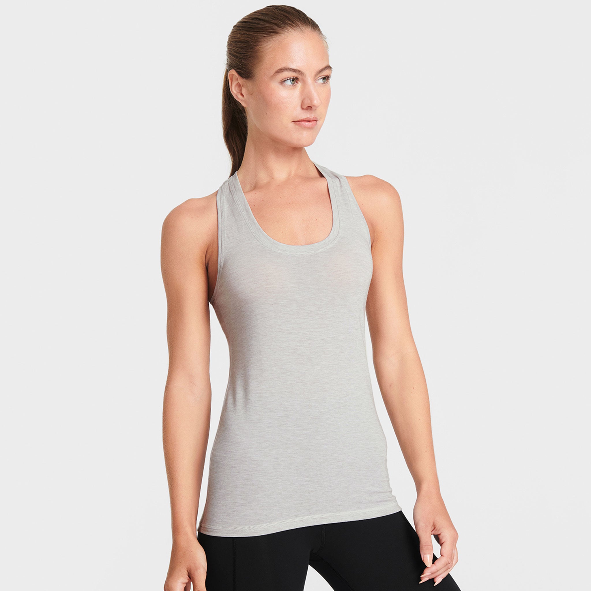 The Ayre Racerback Tank’s flattering fit pairs perfectly with the racerback sports bra for a soft, sporty look. The soft fabric breathes through any workout and the just-below-hip length flatters.